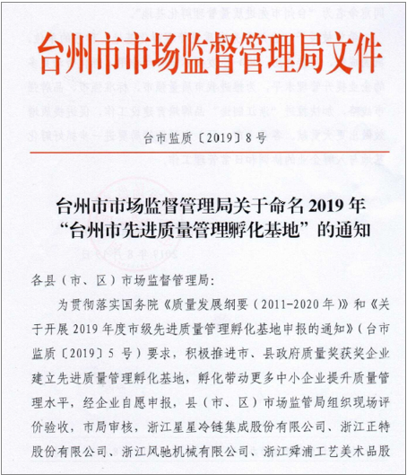 2019年8月19日,臺(tái)州市市場(chǎng)監(jiān)督管理局發(fā)布了臺(tái)市監(jiān)質(zhì)[2019]8號(hào)文件關(guān)于命名2019年“臺(tái)州市先進(jìn)質(zhì)量管理孵化基地”的通知,我公司在2019年度臺(tái)州市級(jí)先進(jìn)質(zhì)量管理孵化基地申報(bào)項(xiàng)目申報(bào)工作中,經(jīng)市場(chǎng)監(jiān)管局組織現(xiàn)場(chǎng)評(píng)價(jià)驗(yàn)收,市局審核,同意命名為“臺(tái)州市先進(jìn)質(zhì)量管理孵化基地”。