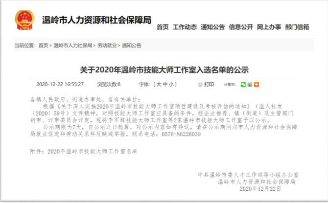 我司根據(jù)《關(guān)于深入實施2020年度溫嶺市技能大師工作室項目建設(shè)及考核評估的通知》(溫人社發(fā)〔2020〕59號)文件精神,通過自行推薦以及地方政府的大力支持,充分準(zhǔn)備了相關(guān)申報資料,通過主管部門的初審以及專家的評審、部門審議和社會公示等評選環(huán)節(jié),我司最終順利通過評審,被評定為“李軍輝技能大師工作室”并于政府平臺公示。