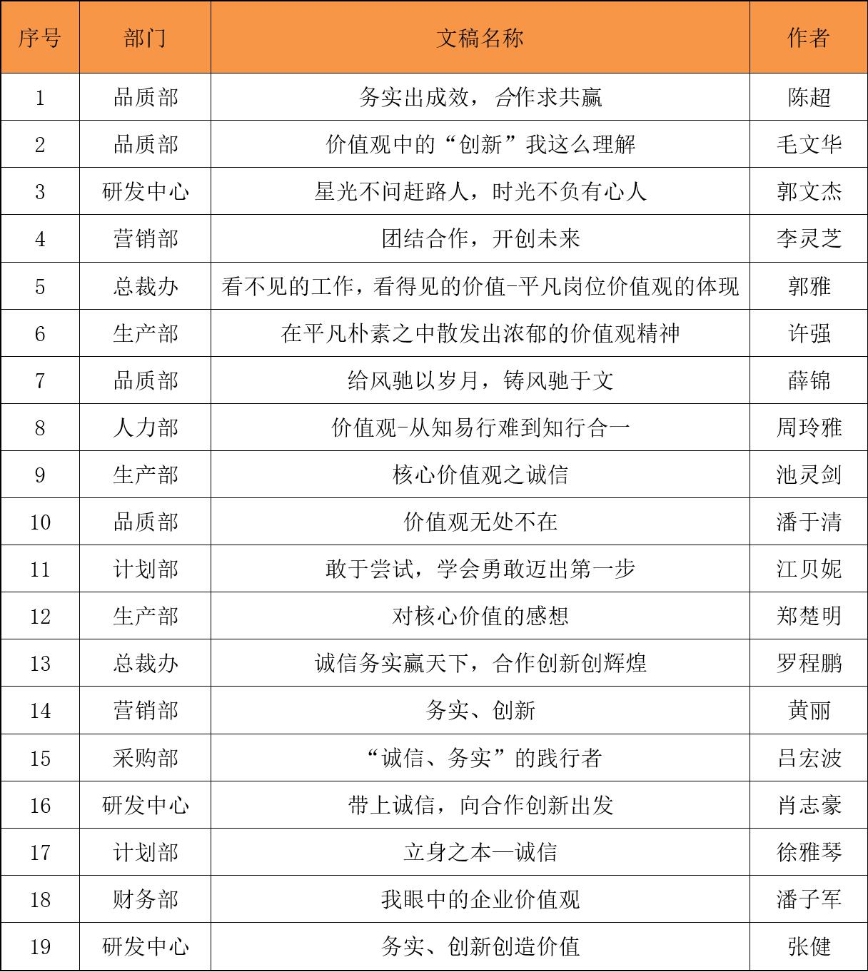 為弘揚(yáng)公司核心價(jià)值觀,使員工能更深刻理解“誠信、務(wù)實(shí)、合作、創(chuàng)新”精神,公司每年組織開展一次“企業(yè)核心價(jià)值觀”征文比賽活動(dòng),2021年度征文比賽活動(dòng)評(píng)比已于8月7號(hào)圓滿結(jié)束。本次活動(dòng)收到來自公司人力資源部、總裁辦、采購部、品質(zhì)部、財(cái)務(wù)部、生產(chǎn)部、計(jì)劃部、銷售部和研發(fā)中心總計(jì)19篇文稿。大家以“核心價(jià)值觀”為主題,立足本部門從實(shí)際出發(fā),擺出鮮活的案例,充分展現(xiàn)了對(duì)公司價(jià)值觀的理解和感悟。